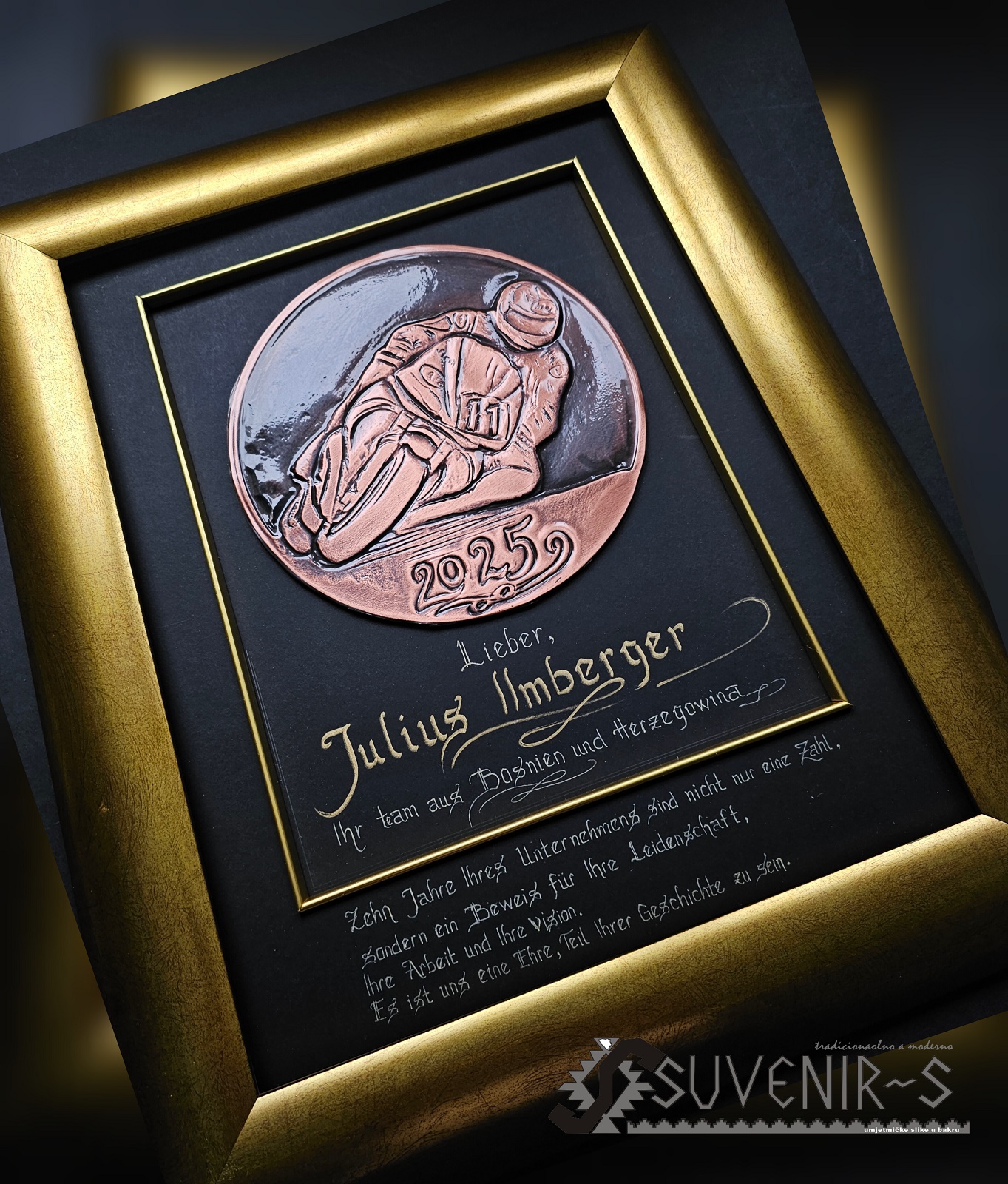 Suveniri i umjetnine u bakru izrađuju se sa najzahtjevnijom preciznošću detalja u visokom reljefu, tradicionalnom tehnologijom koju krasi vještina ručnog umjetničkog zanatstva, a poseban šarm i unikatnost daje im ručno ispisivanje naziva motiva i posveta latiničnom kaligrafijom, kao i bojenje-patiniranje specijalnim patinama
