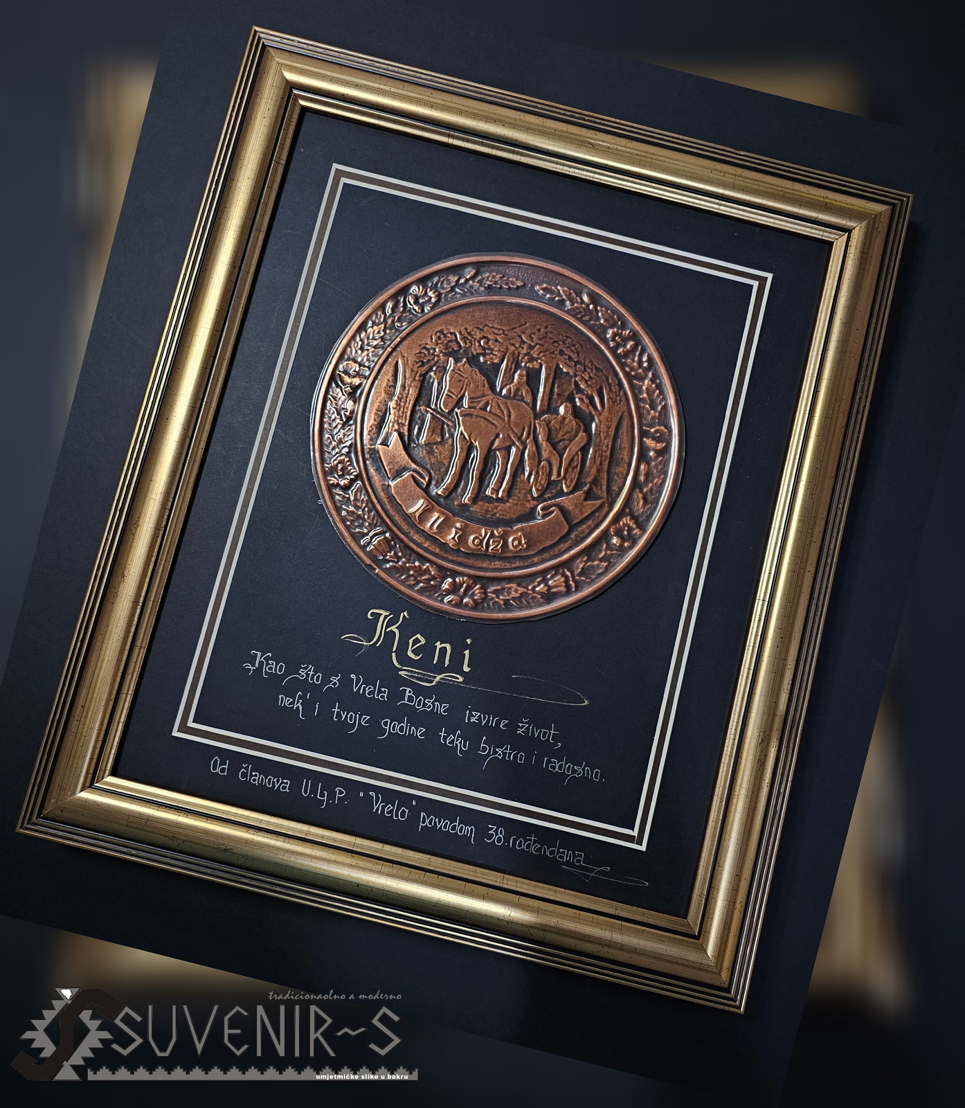 Suveniri i umjetnine u bakru izrađuju se sa najzahtjevnijom preciznošću detalja u visokom reljefu, tradicionalnom tehnologijom koju krasi vještina ručnog umjetničkog zanatstva, a poseban šarm i unikatnost daje im ručno ispisivanje naziva motiva i posveta latiničnom kaligrafijom, kao i bojenje-patiniranje specijalnim patinama
