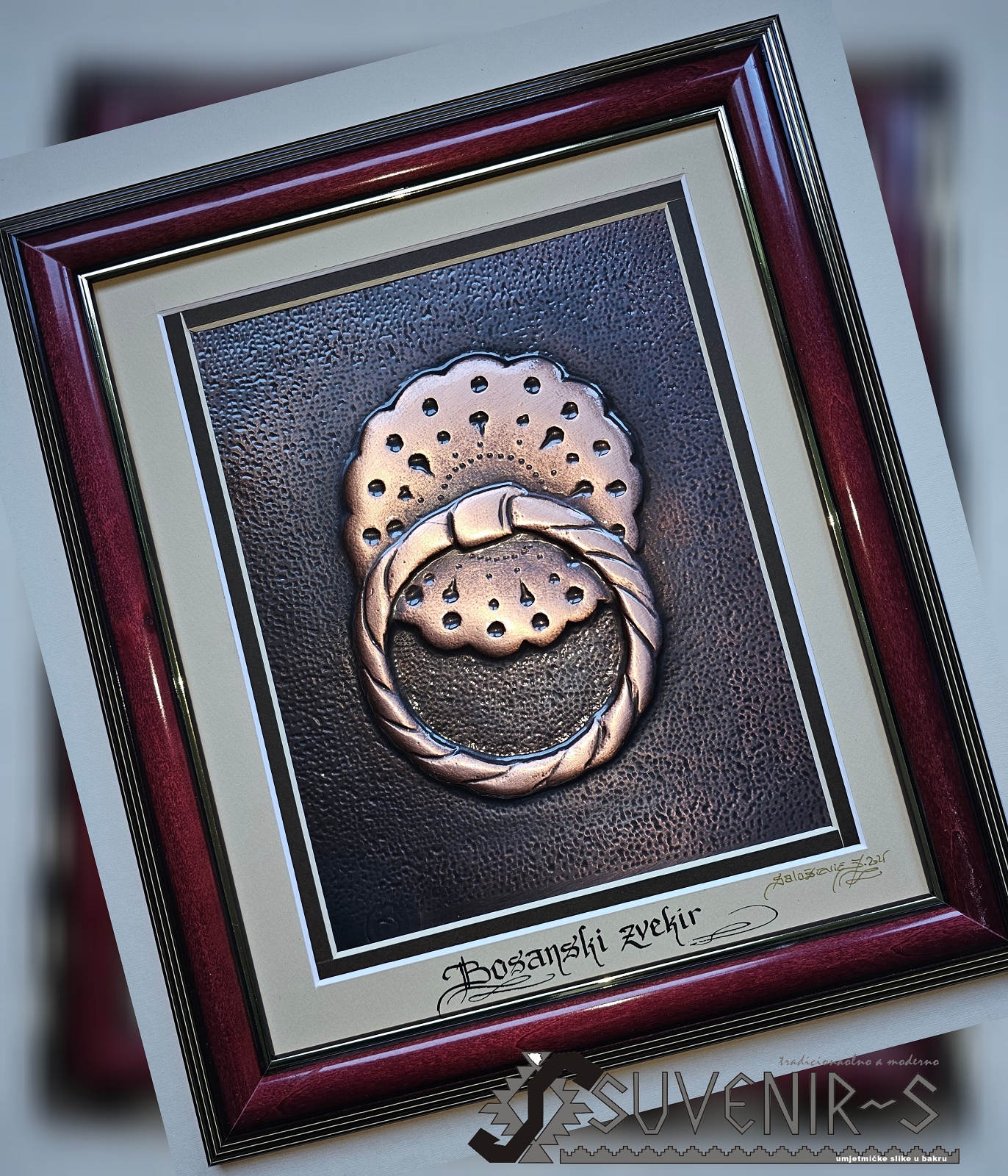 Zidne slike - bakrorezi su urađene sa najzahtjevnijom preciznošću detalja u visokom reljefu, tradicionalnom tehnologijom koju krasi vještina ručnog umjetničkog zanatstva. Poseban šarm i unikatnost im daje ručno ispisivanje naziva motiva latiničnom kaligrafijom na paspartuu.