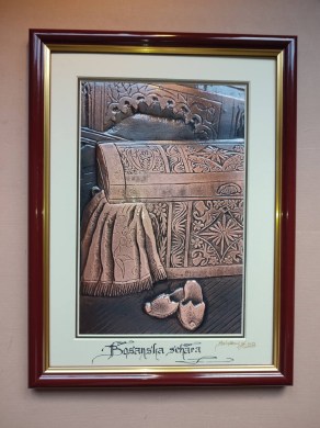 Zidne slike - bakrorezi su urađene sa najzahtjevnijom preciznošću detalja u visokom reljefu, tradicionalnom tehnologijom koju krasi vještina ručnog umjetničkog zanatstva. Poseban šarm i unikatnost im daje ručno ispisivanje naziva motiva latiničnom kaligrafijom na paspartuu.